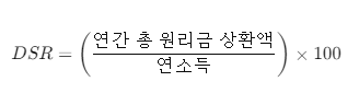 DSR은 차주의 모든 대출(담보대출, 신용대출 등)의 원리금 상환액이 연소득에서 차지하는 비율을 나타내는 지표입니다.