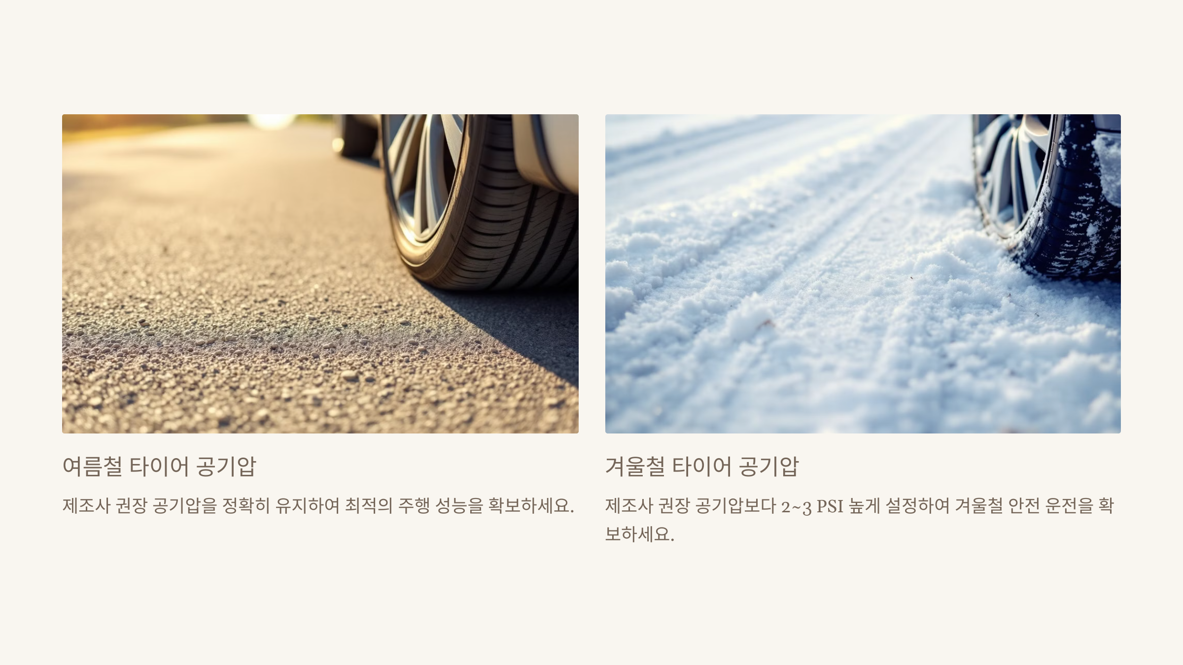 겨울철에는 여름보다 약간 높게 공기압을 설정하는 것이 좋습니다. 하지만 주의할 점은 차량 매뉴얼에 명시된 권장 공기압을 넘지 않도록 해야 해요.