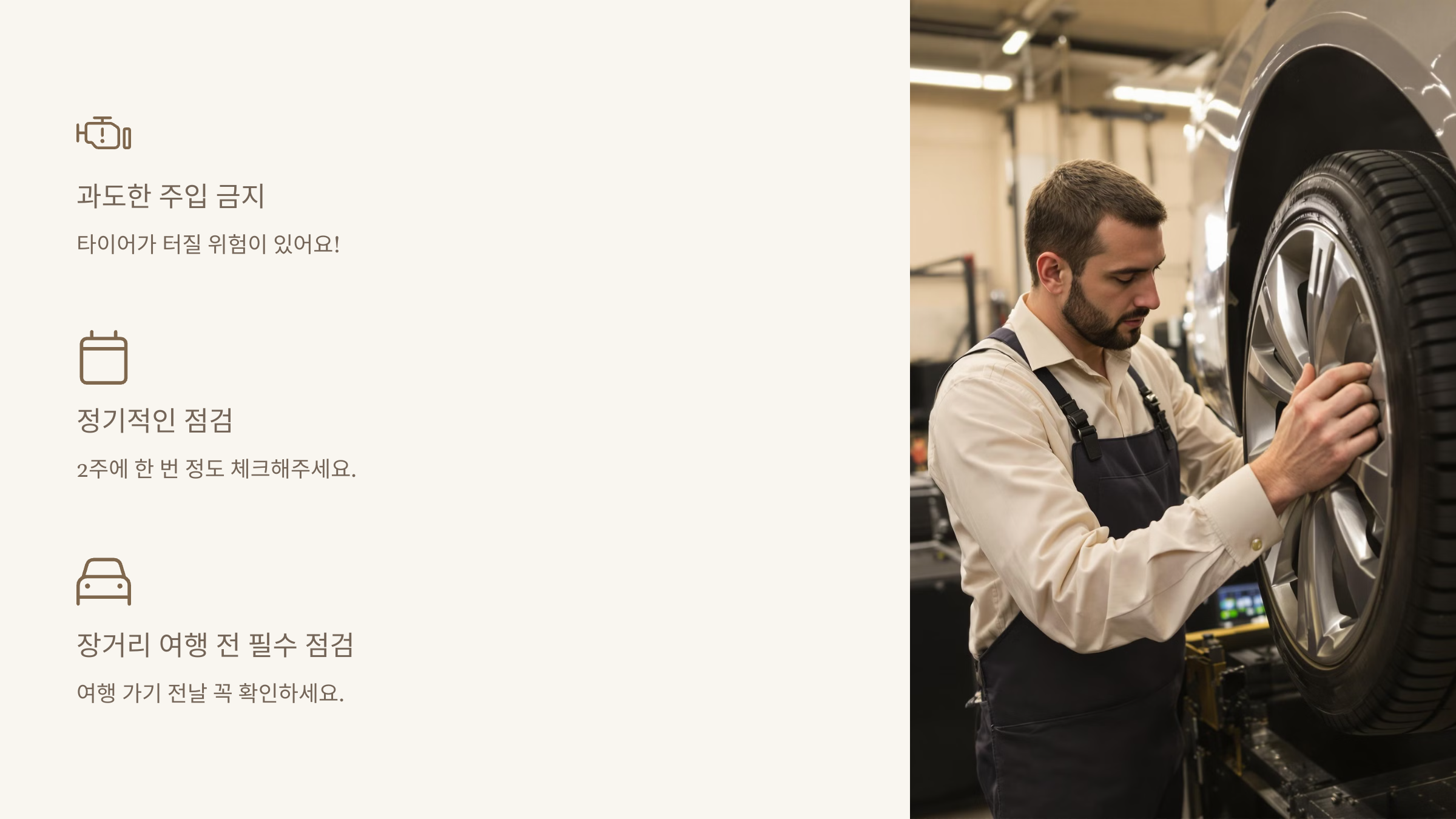 여러분은 평소 타이어 공기압을 얼마나 자주 체크하시나요? 겨울철에는 2주에 한 번 정도 체크하는 것이 좋답니다. 안전운전의 첫걸음, 타이어 공기압 관리부터 시작해볼까요? 💪