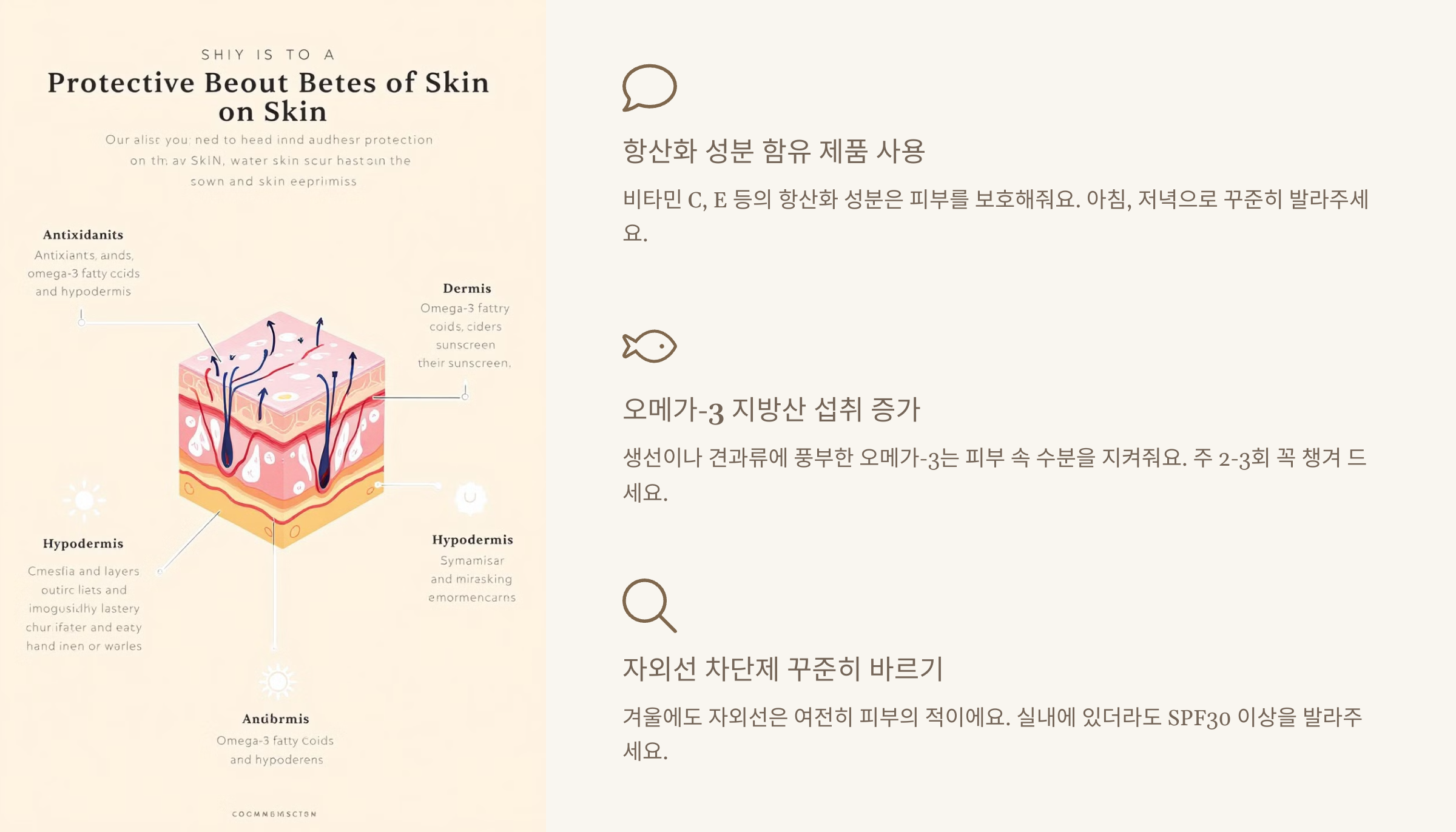 자, 이제 겨울철 피부 관리의 핵심인 보습과 보호에 대해 알아볼까요? 이 두 가지만 잘 지켜도 피부 건강의 절반은 성공했다고 볼 수 있어요!