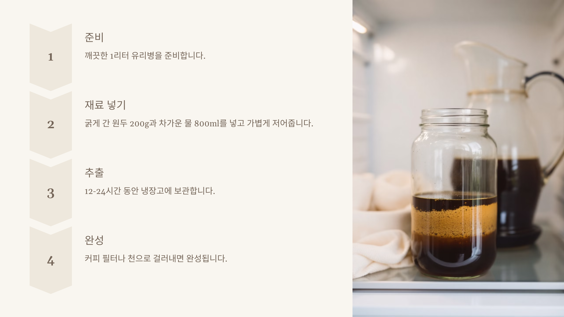 집에서도 간단하게 더치커피를 만들 수 있어요. 특별한 도구 없이도 가능하답니다!