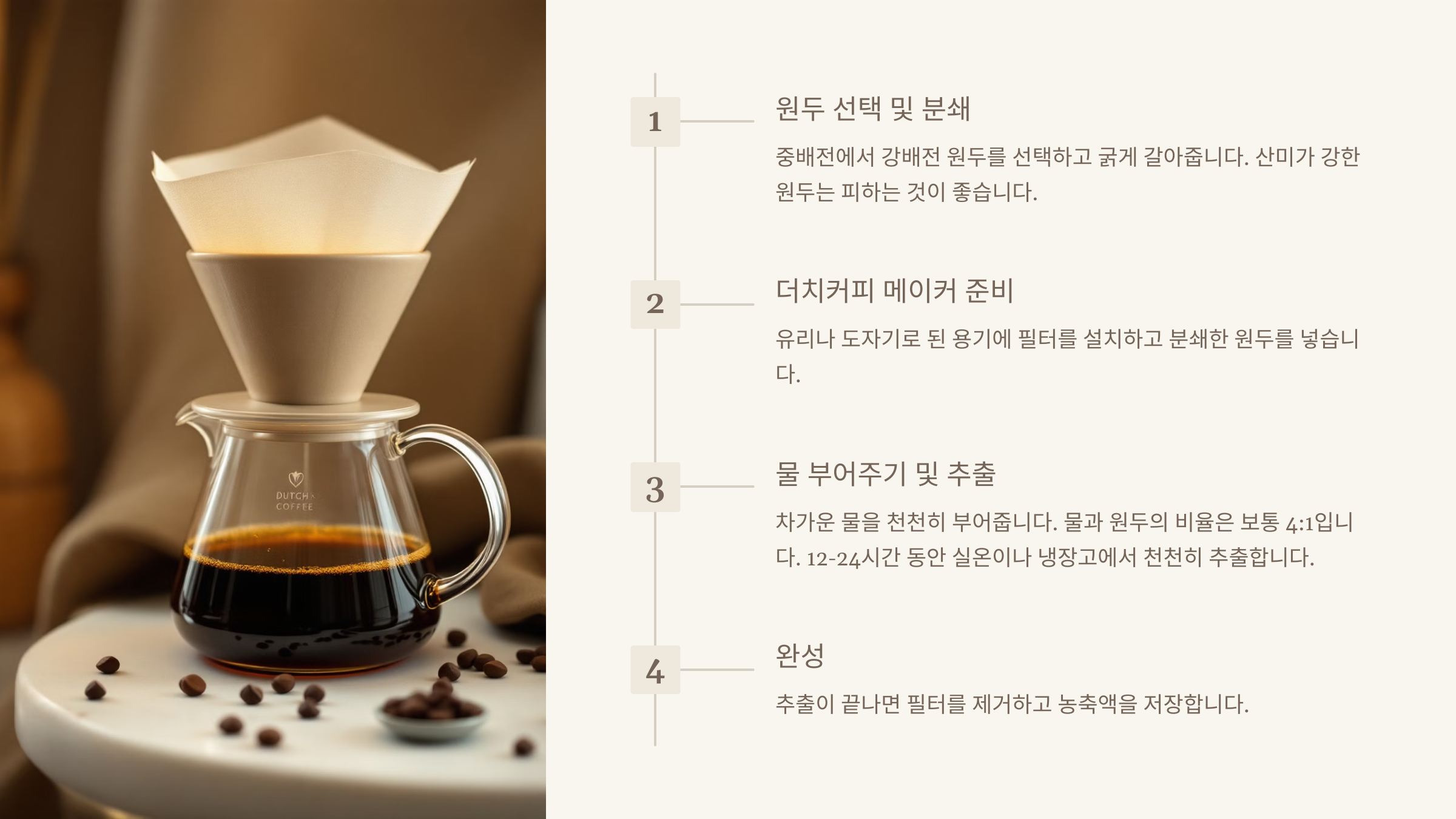 여러분, 혹시 더치커피라는 말을 들어보셨나요? 🤔 요즘 카페나 편의점에서 자주 보이는 이 매력적인 커피, 과연 어떤 특별함이 있는 걸까요?