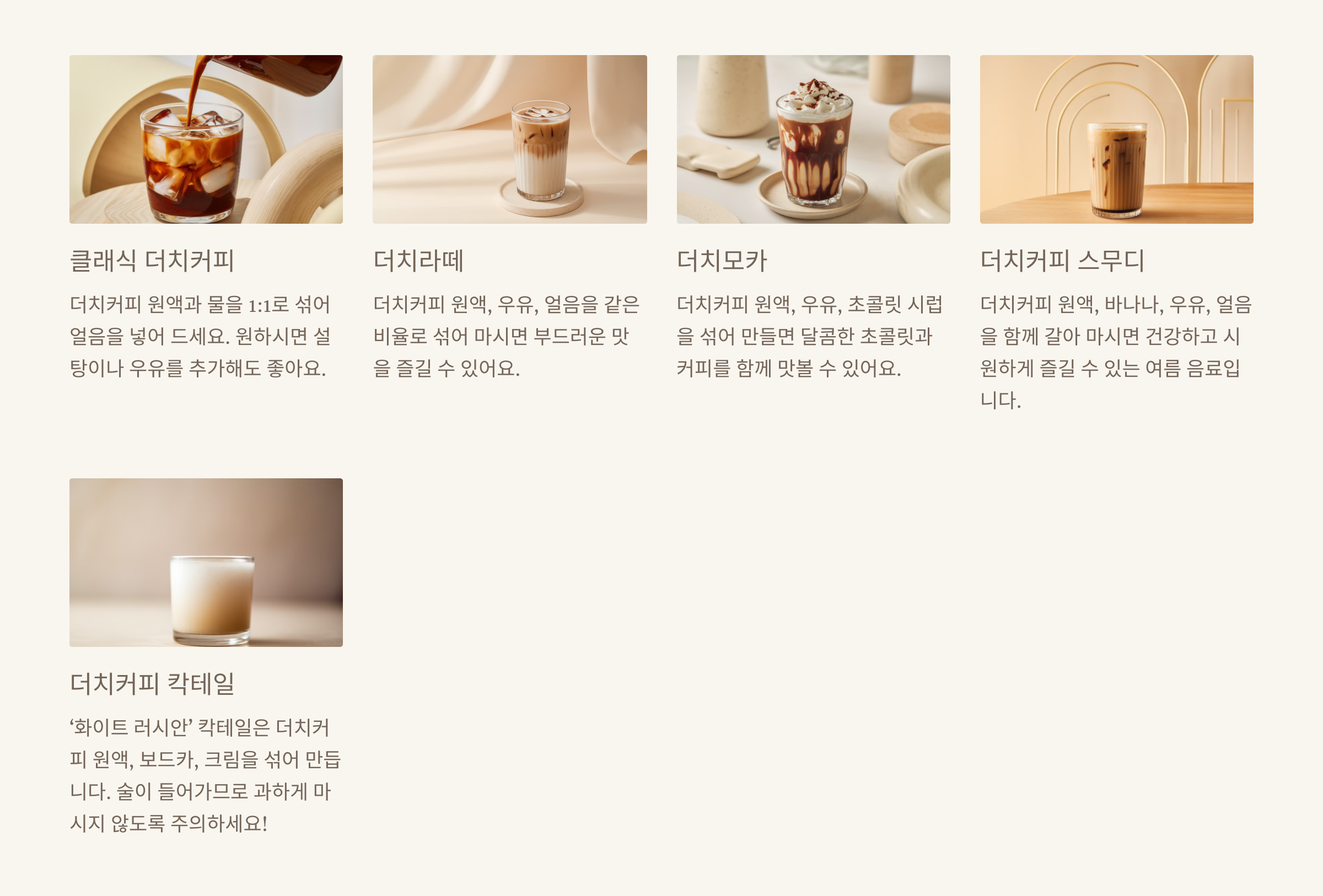 이 외에도 더치커피를 활용한 다양한 레시피가 있어요. 여러분만의 창의적인 레시피를 만들어보는 것은 어떨까요? 🍹