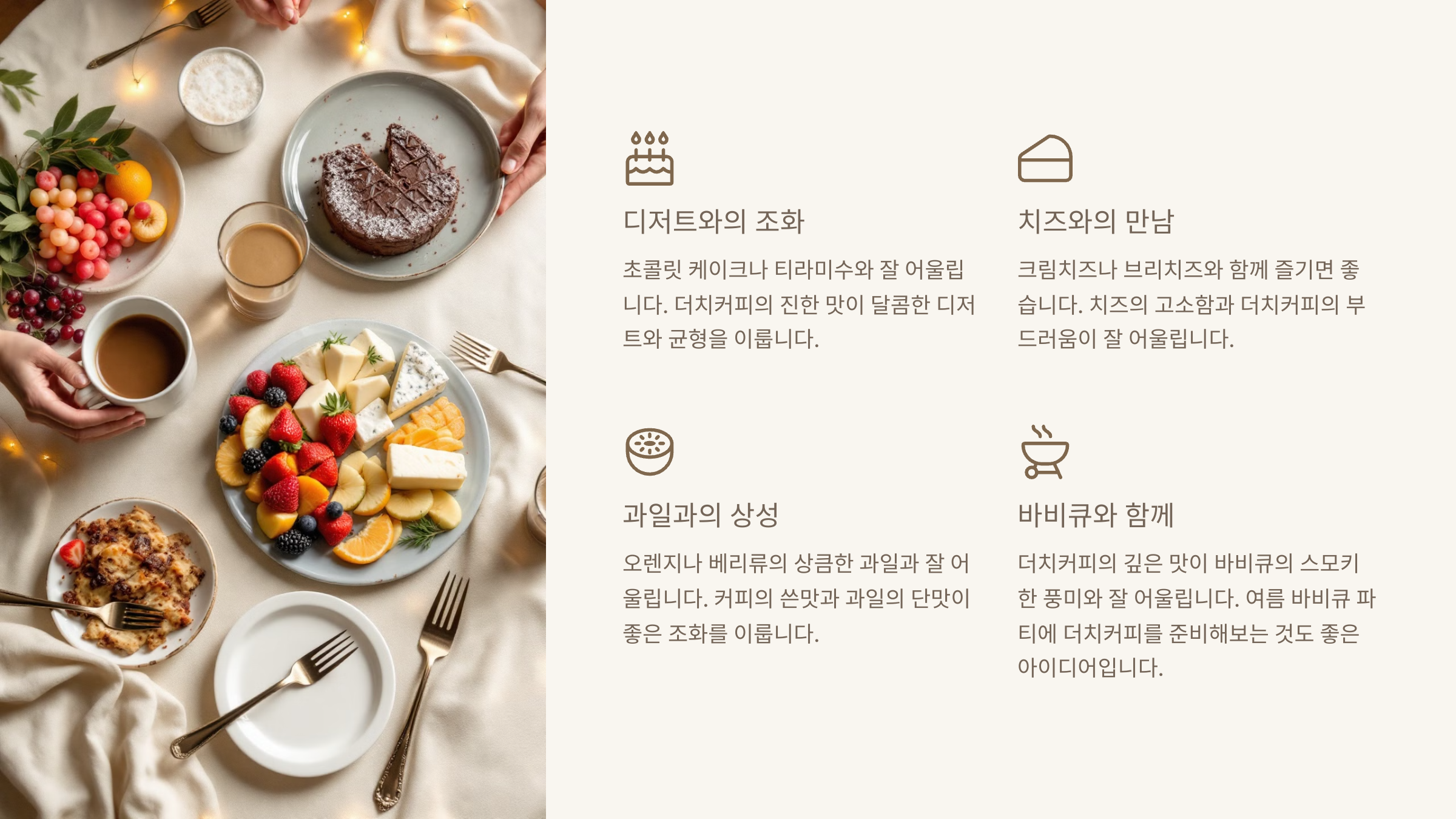 더치커피는 그 자체로도 맛있지만, 다른 음식과 함께 즐기면 더욱 풍부한 맛을 경험할 수 있어요.