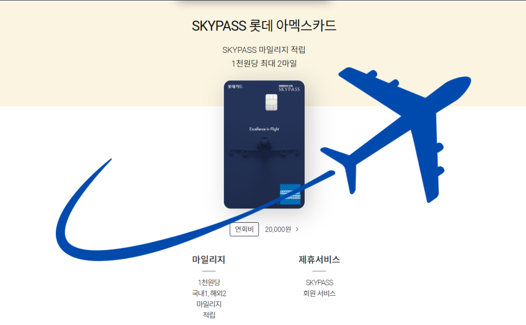 롯데 아멕스 스카이패스 | 20,000원 | 1,000원당 2마일 | ✅ 가능 | 롯데 계열사 할인 |