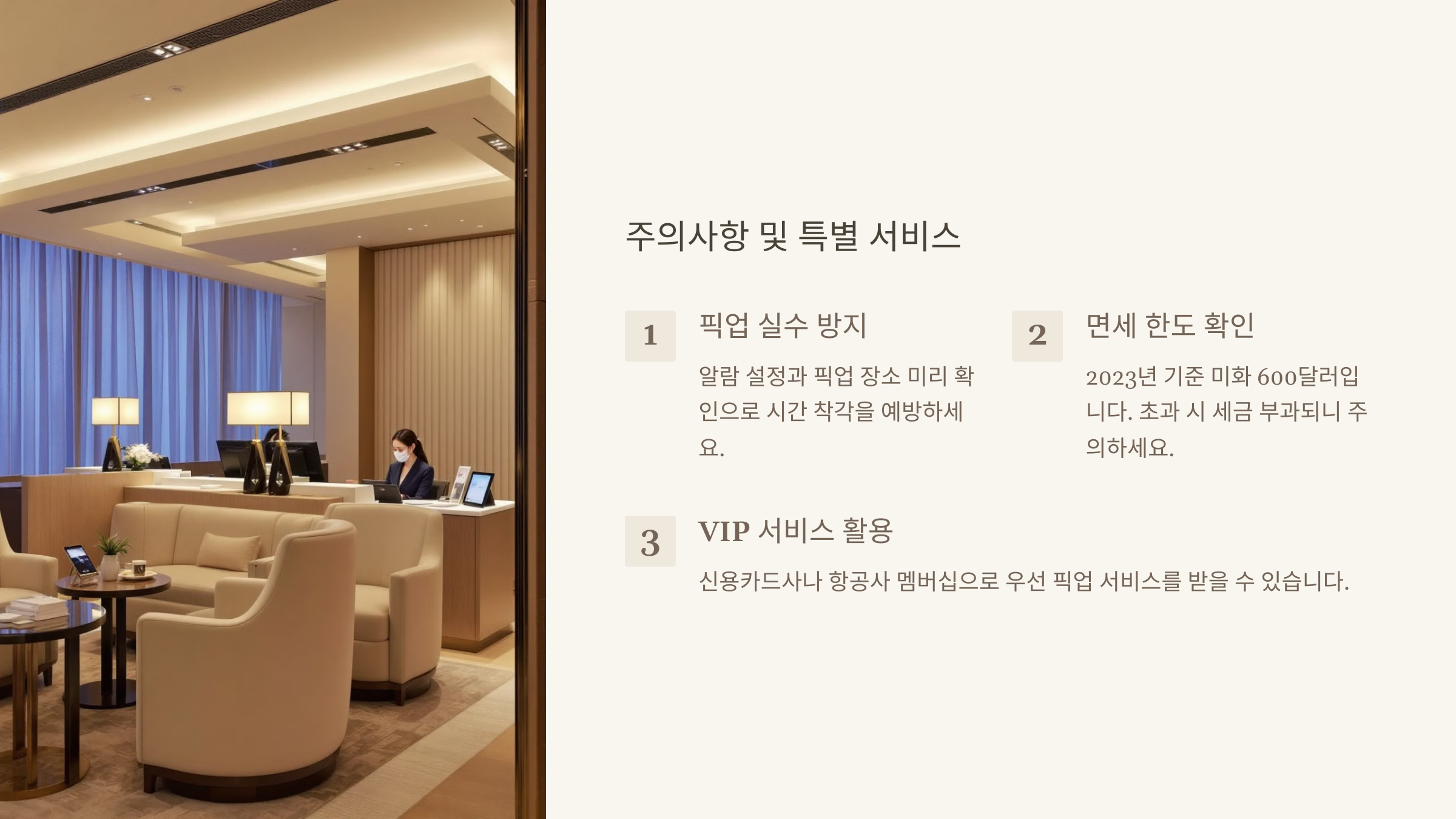 마지막으로, 인천공항 면세점 픽업 시 꼭 알아야 할 주의사항과 유용한 꿀팁들을 알아볼까요? 이 정보들만 잘 기억해도 여러분의 공항 경험이 한층 업그레이드될 거예요!