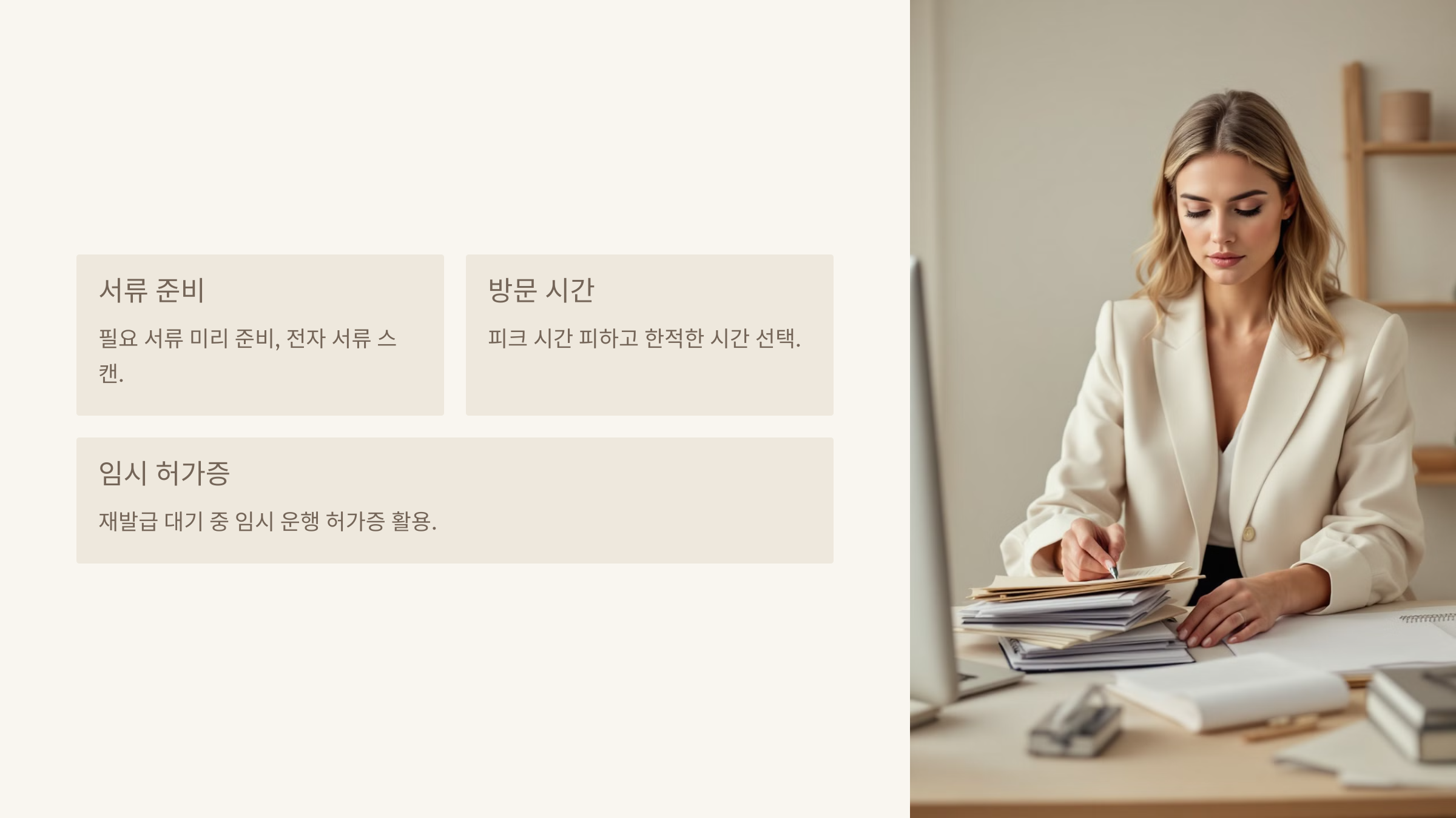 🚨 주의사항: 재발급 전까지는 가능한 운전을 자제하는 것이 좋아요. 만약 불가피하게 운전해야 한다면, 임시 운행 허가증을 반드시 지참하세요!