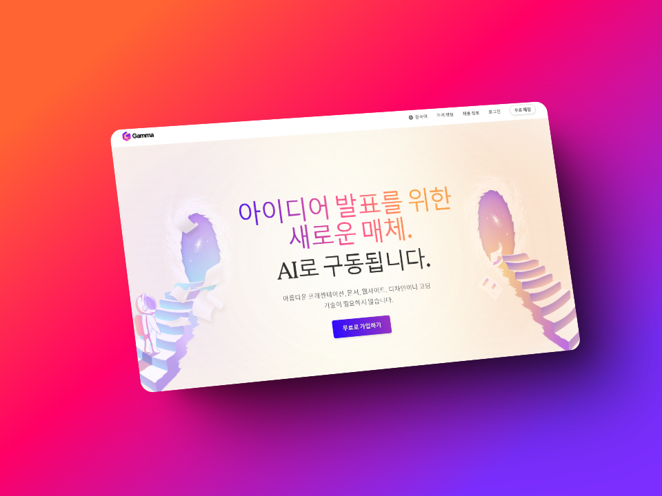 감마 AI는 문서 시각화 도구로, 간단한 텍스트 입력만으로도 고품질의 PPT, 웹페이지, 문서를 생성할 수 있습니다.