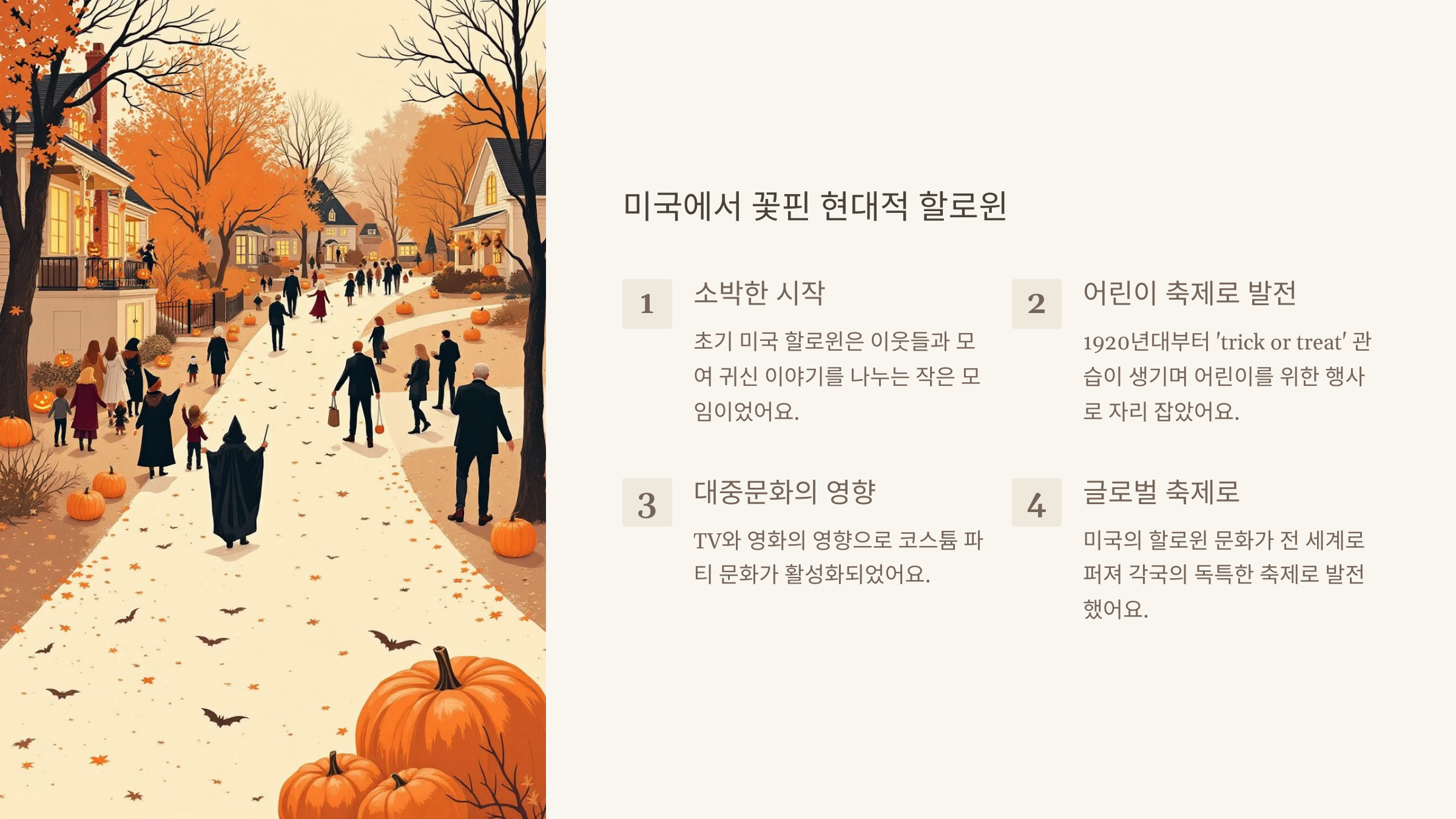 그런데 말이죠, 할로윈이 정말 크게 바뀐 건 20세기 중반부터예요. TV와 영화에서 할로윈을 다루기 시작하면서 대중문화의 중요한 부분이 된 거죠. 《찰리 브라운의 할로윈》같은 애니메이션이나 《할로윈》 시리즈 같은 공포 영화들이 할로윈의 이미지를 만들어갔어요. 이런 영향으로 코스튬을 입고 파티를 즐기는 문화가 더욱 활성화되었답니다.