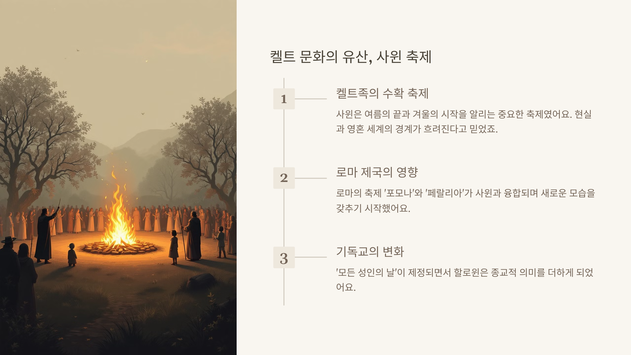 재미있는 사실! 📚 켈트인들은 사윈 축제 때 큰 모닥불을 피우고 동물 뼈를 태웠다고 해요. 이게 바로 지금 우리가 할로윈에 초를 켜는 전통의 시초랍니다.
