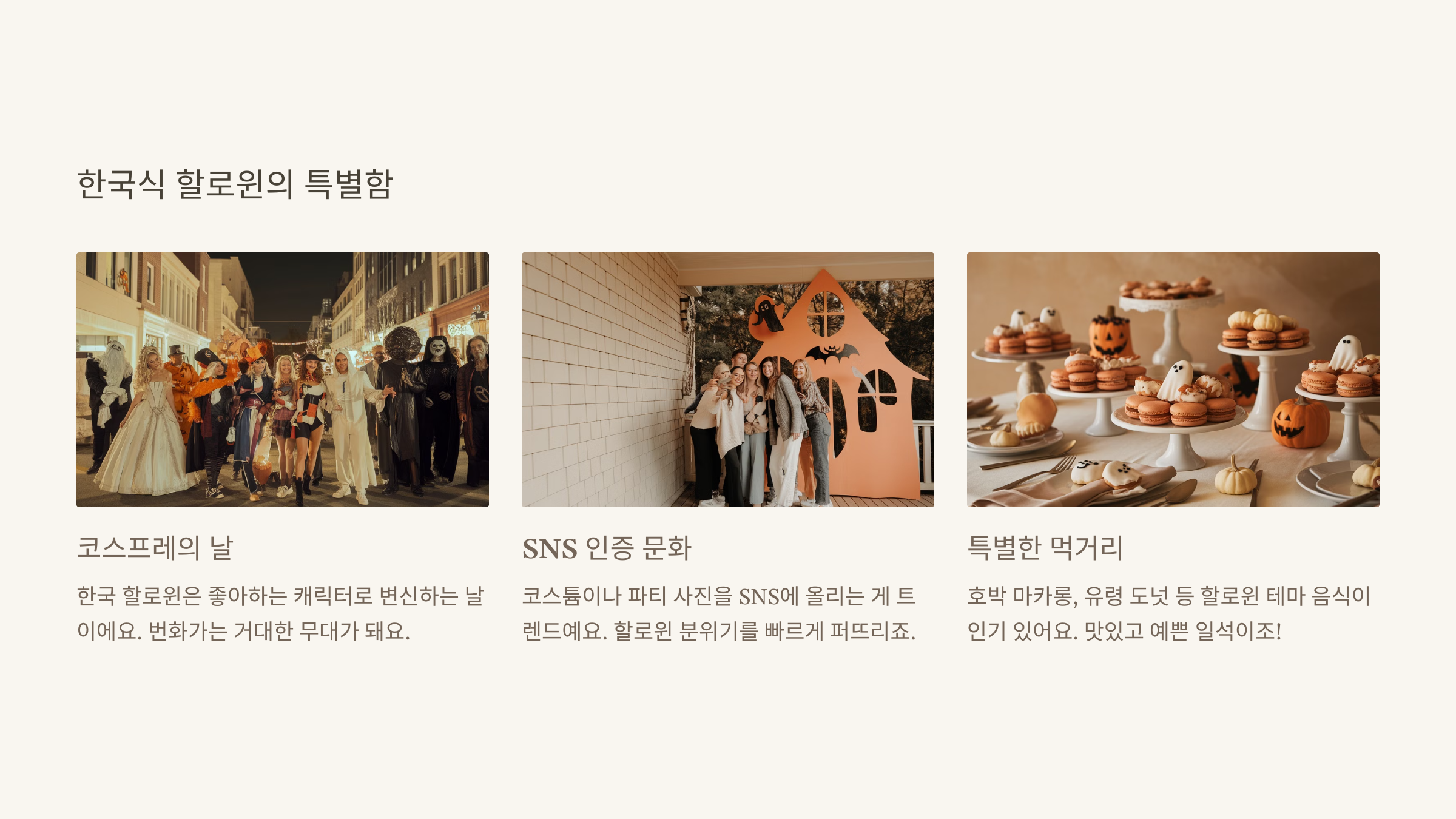여러분은 한국식 할로윈을 어떻게 즐기고 계신가요? 특별히 기억에 남는 할로윈 경험이 있다면 공유해주세요! 올해는 어떤 코스튬을 준비하고 계신가요? 🎃👻