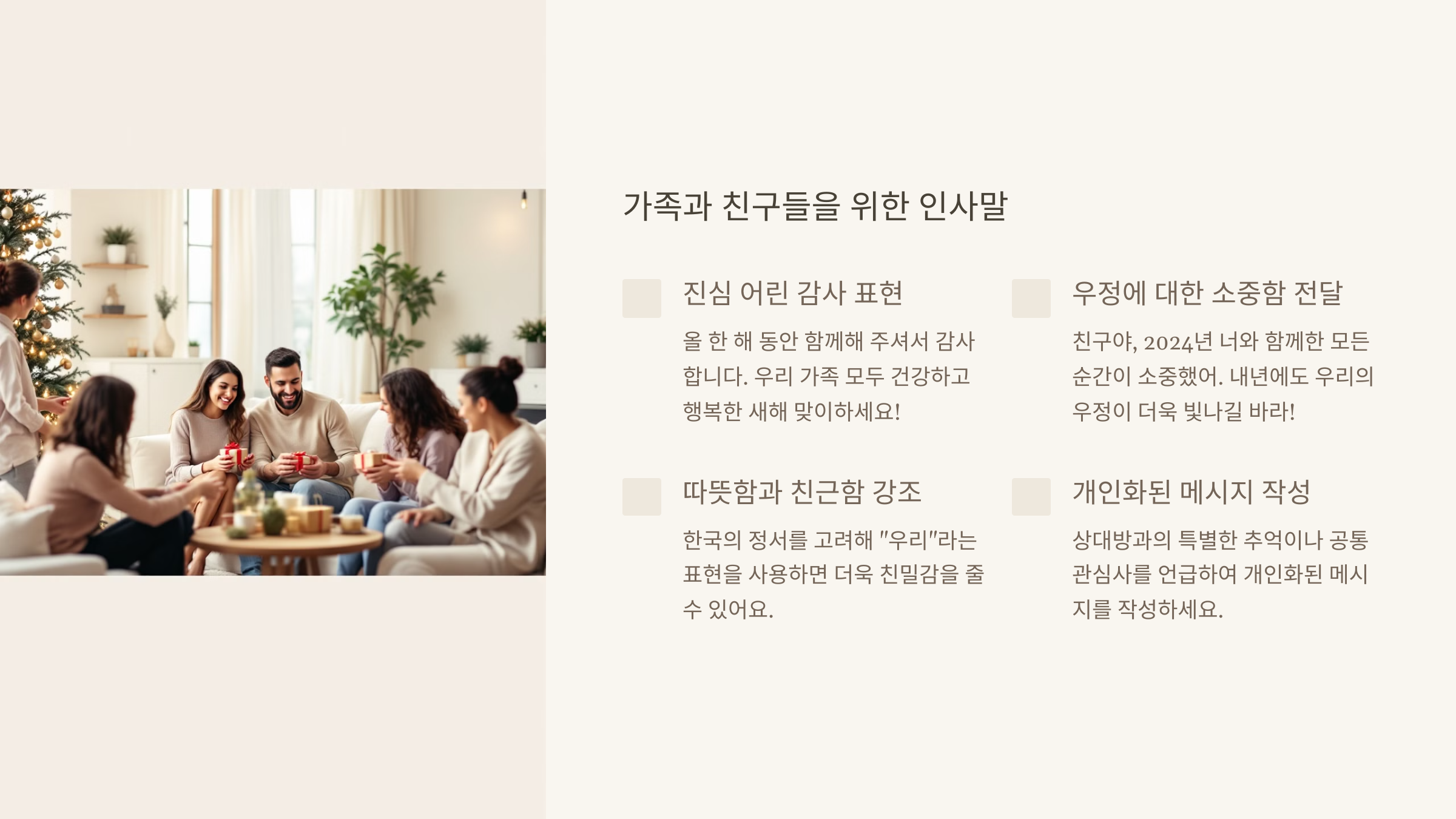 2024년을 마무리하는 지금, 우리 주변의 소중한 사람들에게 따뜻한 마음을 전할 때입니다. 가족, 친구, 연인 등 개인적인 관계에서 사용할 수 있는 마무리 인사말을 살펴볼까요? 😊